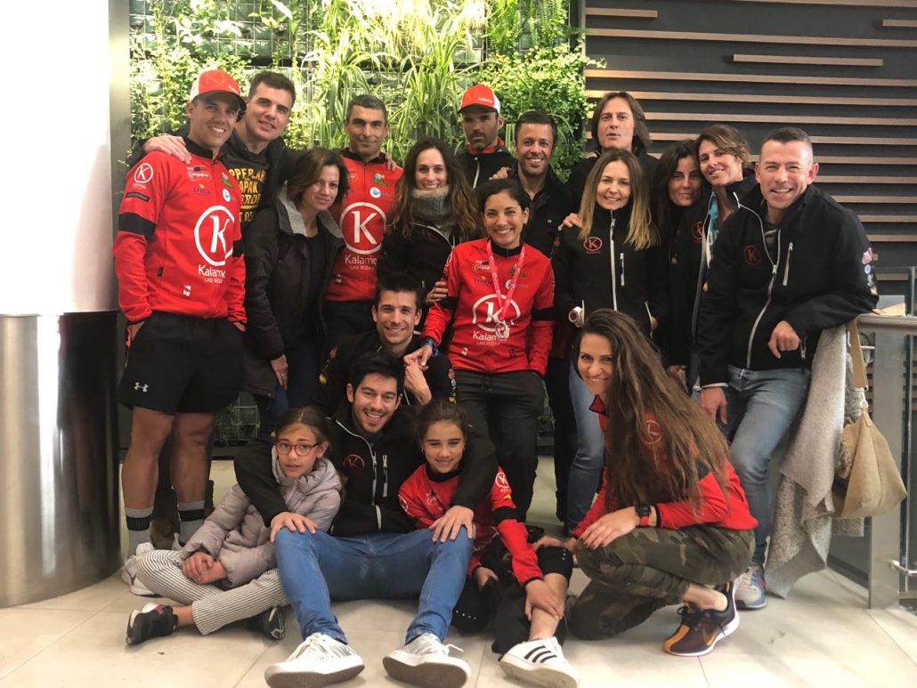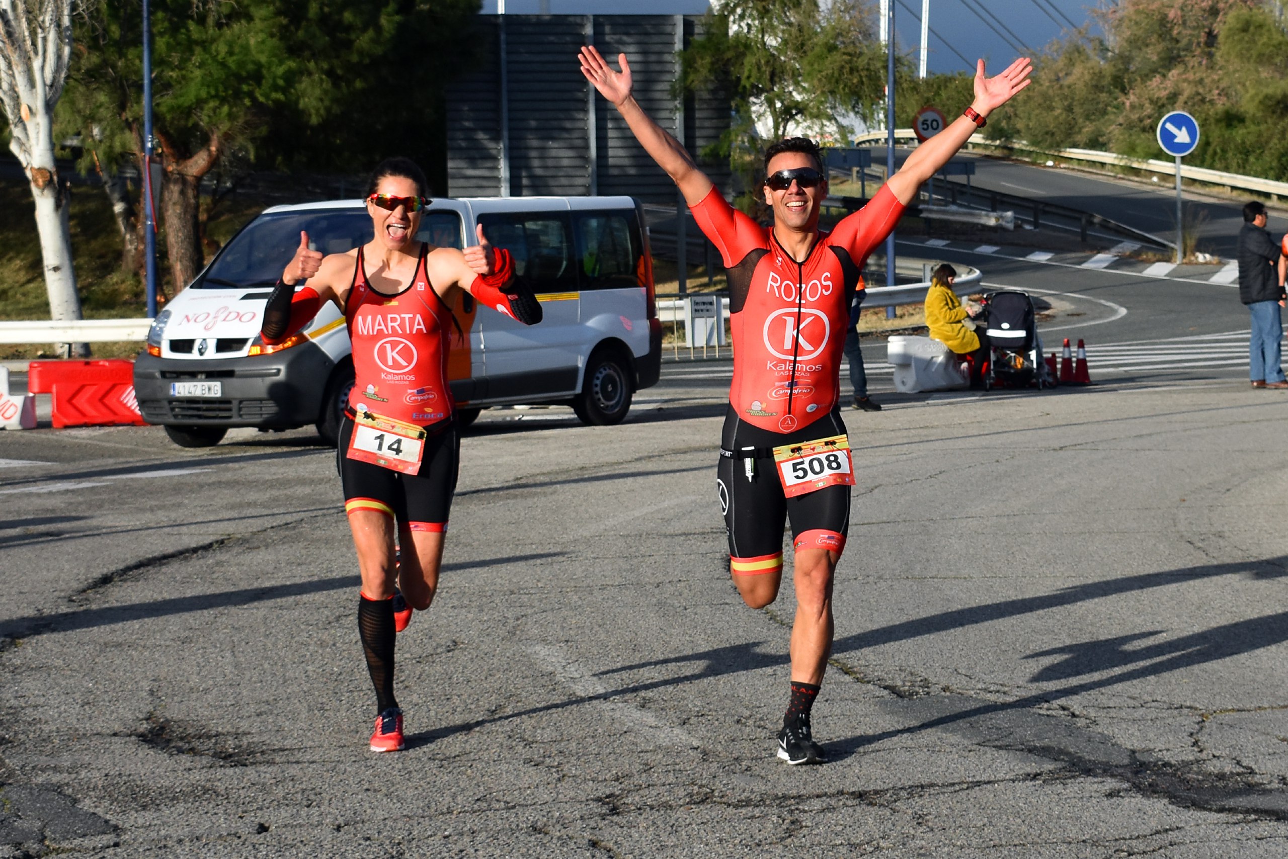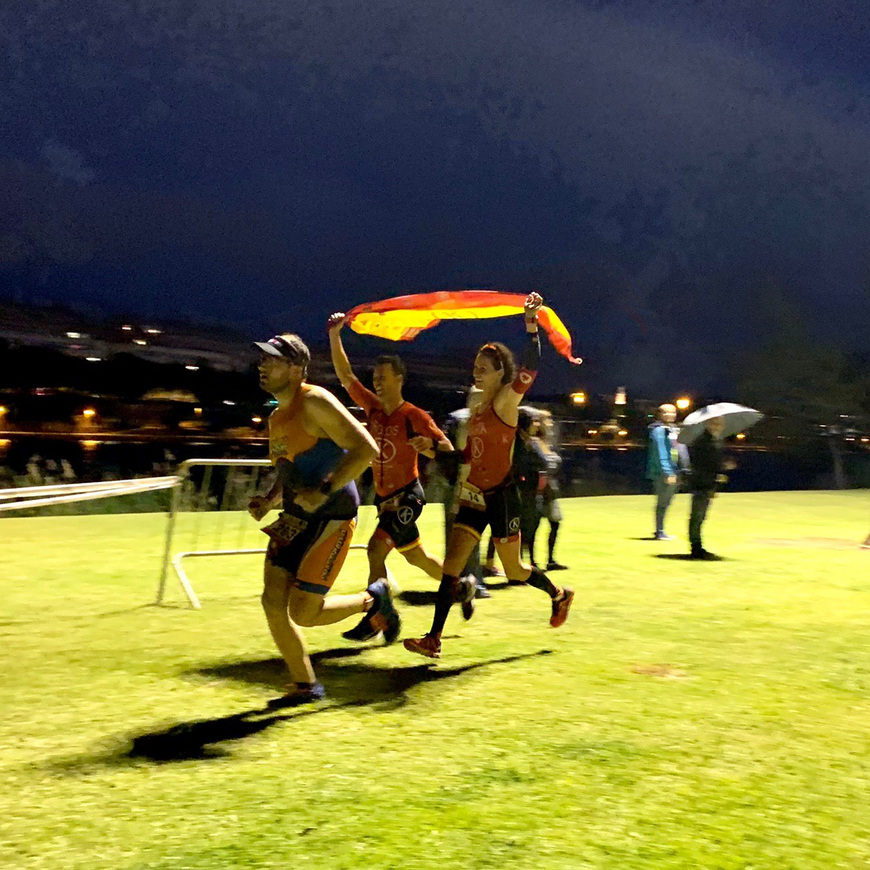 Mi marido me estaba esperando desde hacía bastante rato, supongo que se quería asegurar que llegaba entera de esa bici tan épica que tuvimos que superar;  y comenzamos a correr, con el miedo de que mi dolor en la cintilla iliotibial apareciese en cualquier momento y con una hipotermia en los dedos de los pies, que hasta el km 8 no empecé a sentirlos, pero me encontraba bien, supongo que al no forzar demasiado en la bici, aún tenía fuerzas, y pude hacer la media maratón, pasando mucho frío sobretodo en el tramo final, ya que se hizo de noche , pero sin sufrir  demasiado y sobretodo sin casi dolor en la rodilla, creo que la emoción, la adrenalina, y la suerte jugaron su papel, porque al día siguiente estaba bastante cojita; pero acabé… mi marido me esperó en los últimos km para entrar juntos en meta, levantando la bandera española,  y compartir una sensación que no muchos tienen la suerte de disfrutar; y mi hija mayor Marta, también corrió el último km conmigo animándome.
