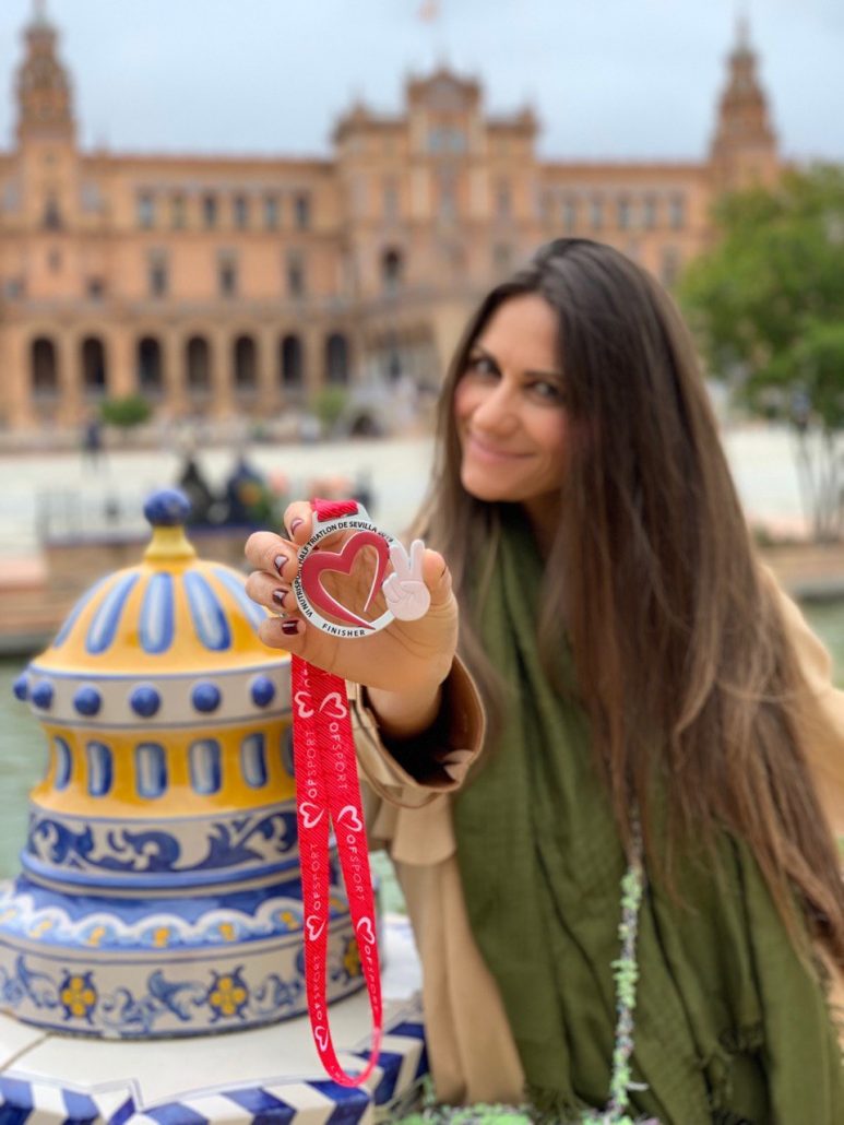 Sevilla nos esperaba el 6 de Abril, y sin darme cuenta en un abrir y cerrar de ojos llegó ese deseado día, porque sí, no le tenía ningún miedo, tenía tanta ilusión por realizar mi primer Half que, ni unos contratiempos de salud que surgieron mes y medio antes de la prueba y me dejaron 3 semanas seguidas sin entrenar absolutamente nada, y la famosa cintilla del corredor que afloró 1 mes antes y me impidió correr hasta el día de la prueba, ni siquiera eso me iba a frenar el tomar la salida, deseaba estar allí!!!
